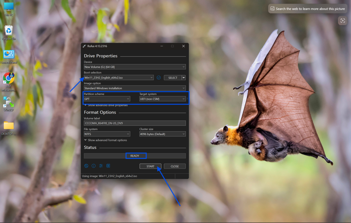 Set the file system. Rufus usually sets this automatically based on your ISO. For Windows, NTFS is standard. For Linux live drives, FAT32 works in most cases.
