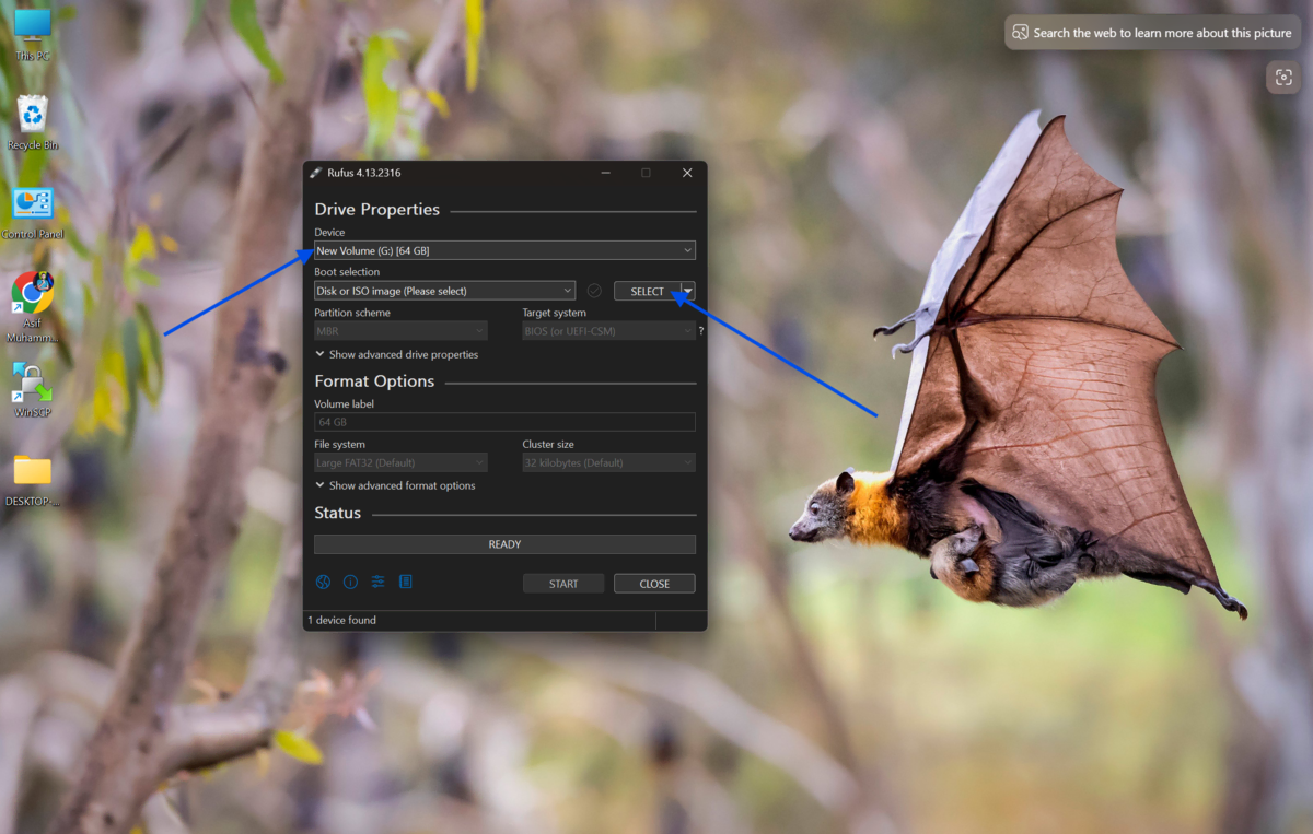 If your USB is not detected, try a different port or restart Rufus as an administrator.